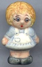 Little girl full figure in blue dress and apron blonde realistic by Shirley Shaw in 1981 7/8 x 1-3/8 NBS large