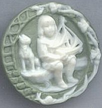 Buster Brown and Tige with sailboat green and white Jasperware by Stella Rzanksi in 1996 with snail in border a studio 1-1/4 dia NBS medium